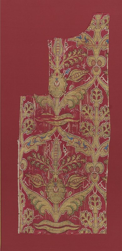 Tessuto con motivo a cintamani, tulipani, garofani e steli intrecciati